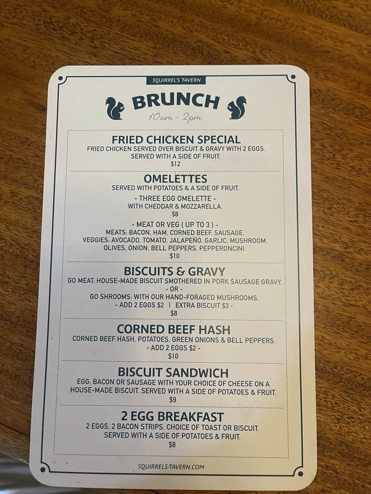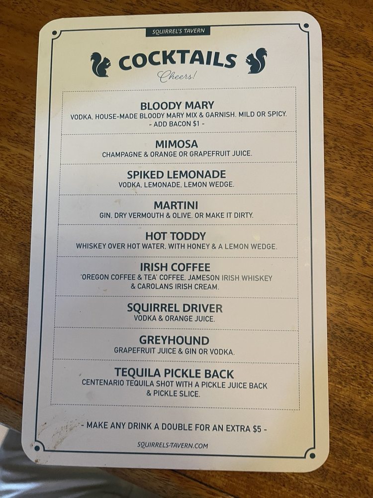 “ Unexpectedly surprised. The place doesn't look like much from the outside but we stopped because of the yelp reviews. Convenient stop between our home and the Eugene Airport. On the inside the place is full of personality, history and lots and lots of squirrel art. I found it interesting and fun. You definitely get a feel of local dive bar but in a good way. We were greeted immediately. I ordered a Bloody Mary to sip while I perused the menu. It was delicious but I was disappointed it didn't look anything like the photo I saw on Yelp. I got very little garnish which is half the fun of a Bloody Mary. We were excited we could order breakfast or dinner. My husband was craving a Squirrel burger and I wanted breakfast. The burger was a classic American cheese burger add ham and egg. It was delicious and well rounded. The breakfast I ordered was the show stopper. I got 2 eggs perfectly cooked a hand formed sausage patty and home fried potatoes and a fresh biscuit! Absolutely delicious! The sausage patties seemed house made as well as the biscuit and potatoes. The cook served our breakfast which is a nice touch. My only suggestion is the biscuit should come with butter and jam. The waitress was busy so it took a while to get her attention my husband had to get up to ask the kitchen which felt intrusive. Not a game changer tho we will go back for breakfast very soon. ”